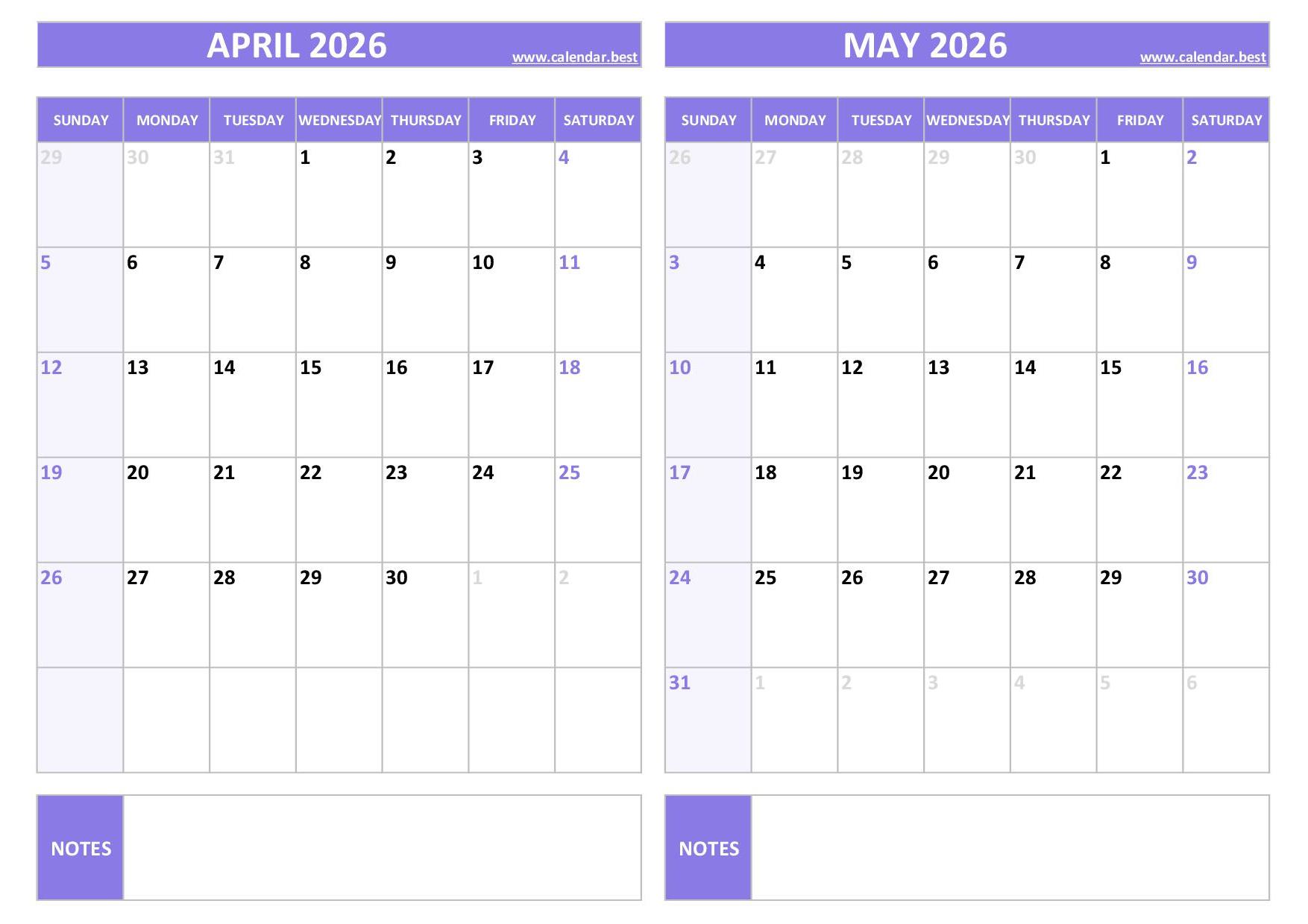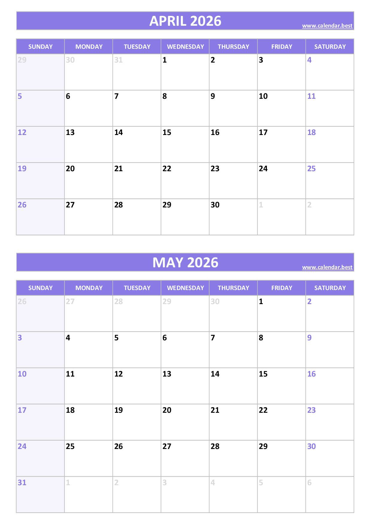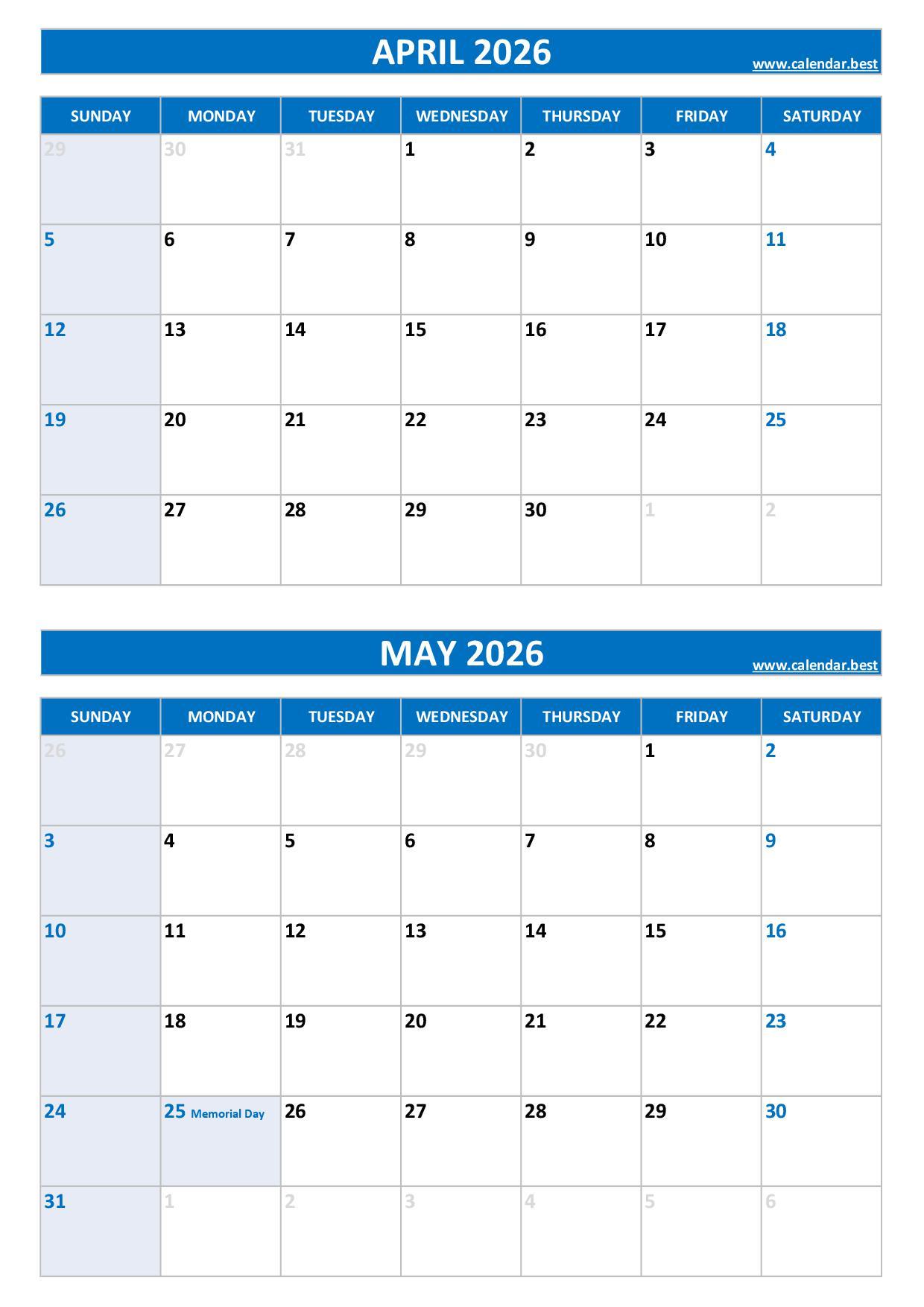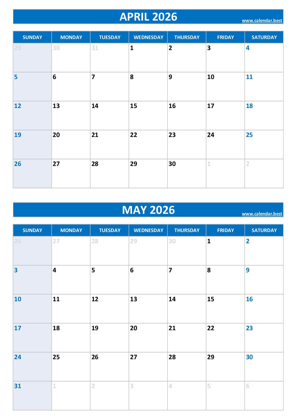 Discover and download our free printable April and May 2026 calendars, all combined on a single page to help you plan your two-month schedule easily.