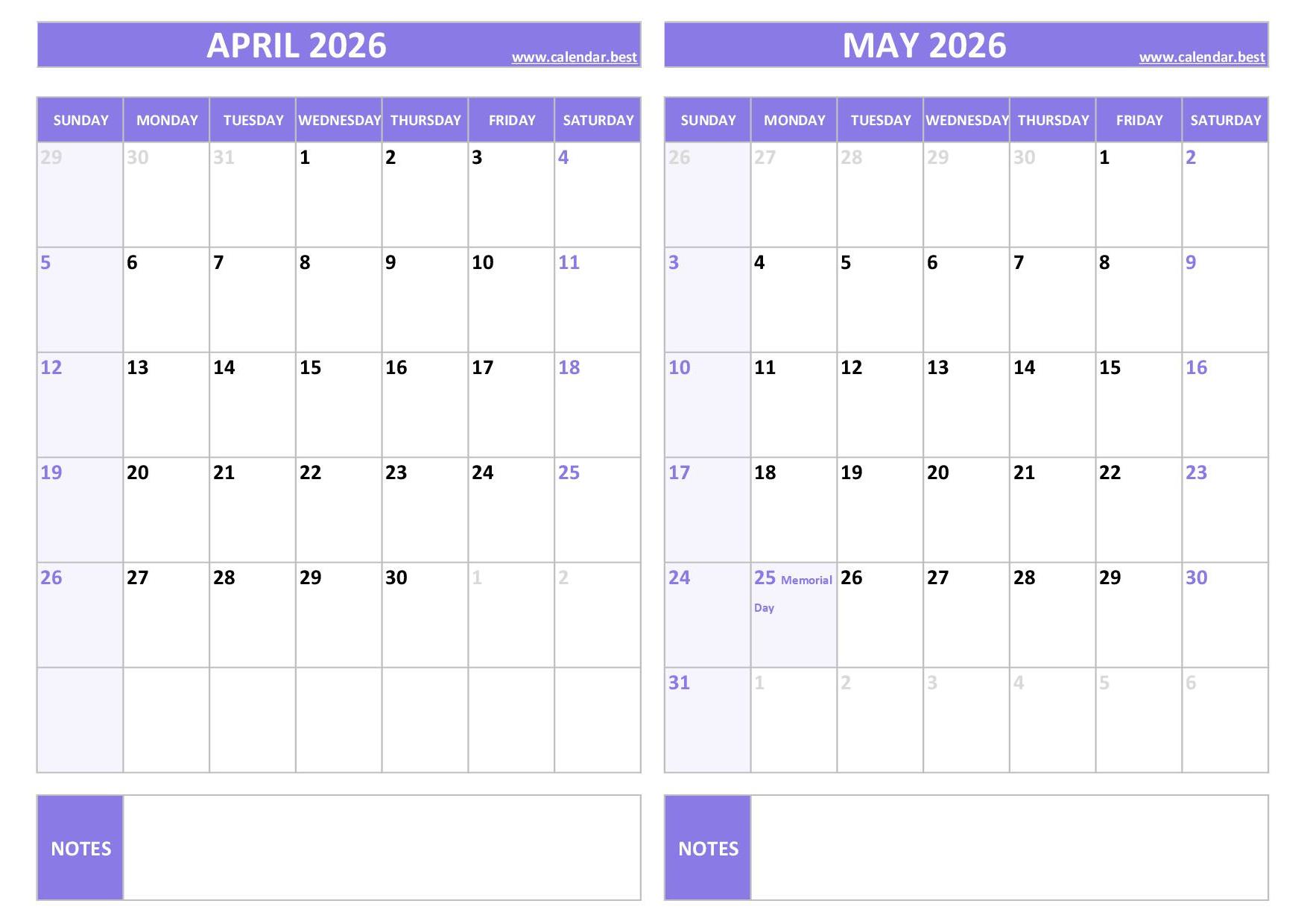 Download your free printable April and May 2026 calendar featuring US federal holidays. This two-month layout spans from April 1 to May 31, 2026, and highlights major dates like Memorial Day (Monday, May 25, 2026). Choose your style (blue or purple), in A4 portrait or landscape, and print as a PDF or JPG.
