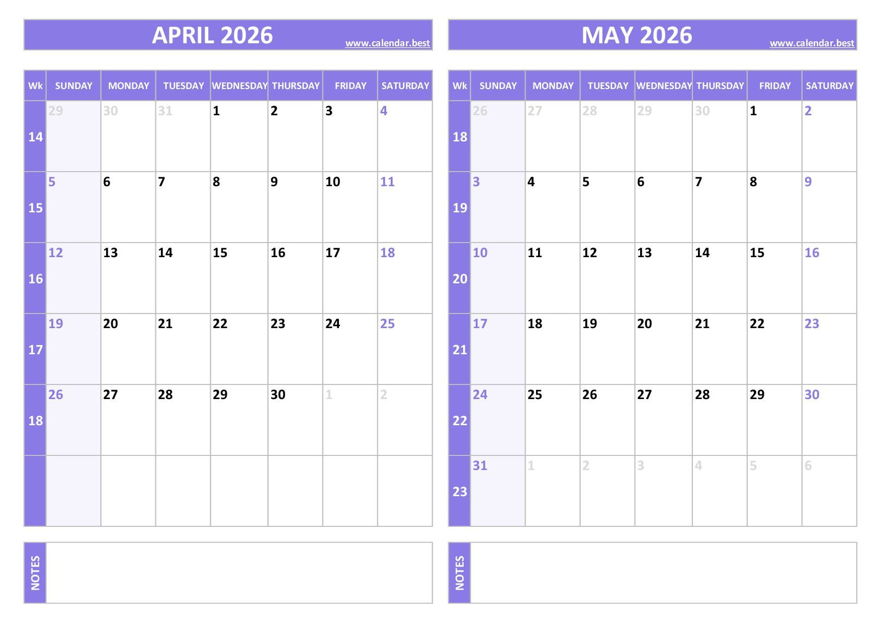 Great for home, school, or office use, this free printable calendar for April and May 2026 includes US week numbers, with weeks starting on Sunday. It spans from week 14 to week 23, offering a clear two-month overview. Available in blue or purple, the calendar comes in A4 format (portrait or landscape), ready to download as PDF or JPG.