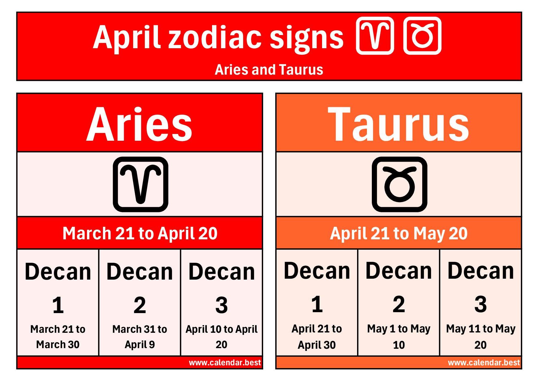 | In April, Aries (Fire) runs from April 1 to 20 (Decans 2 and 3) and Taurus (Earth) from April 21 to 30 (Decan 1). | |||