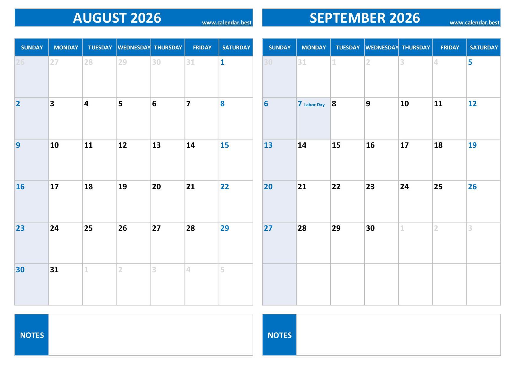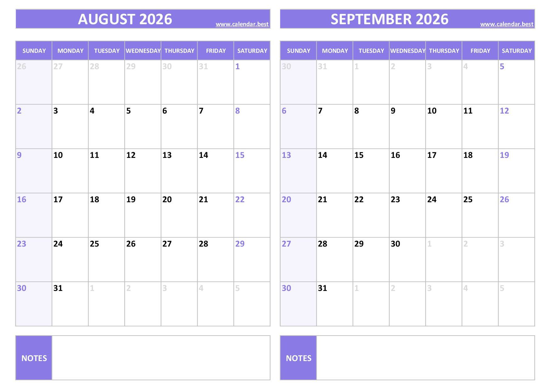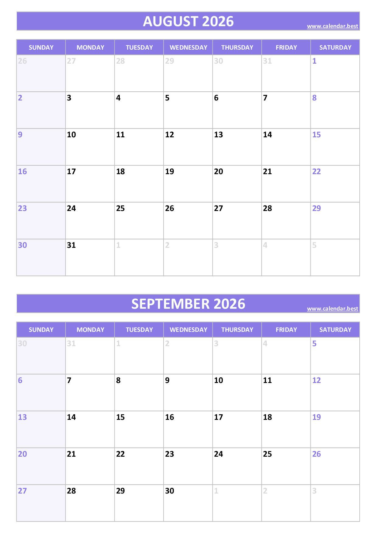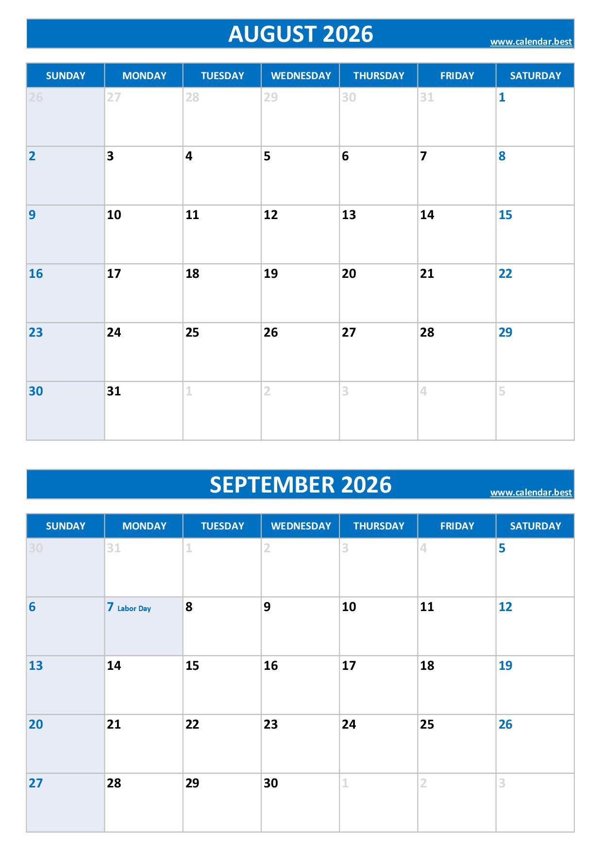 Discover and download our free printable August and September 2026 calendars, all combined on a single page to help you plan your two-month schedule easily.