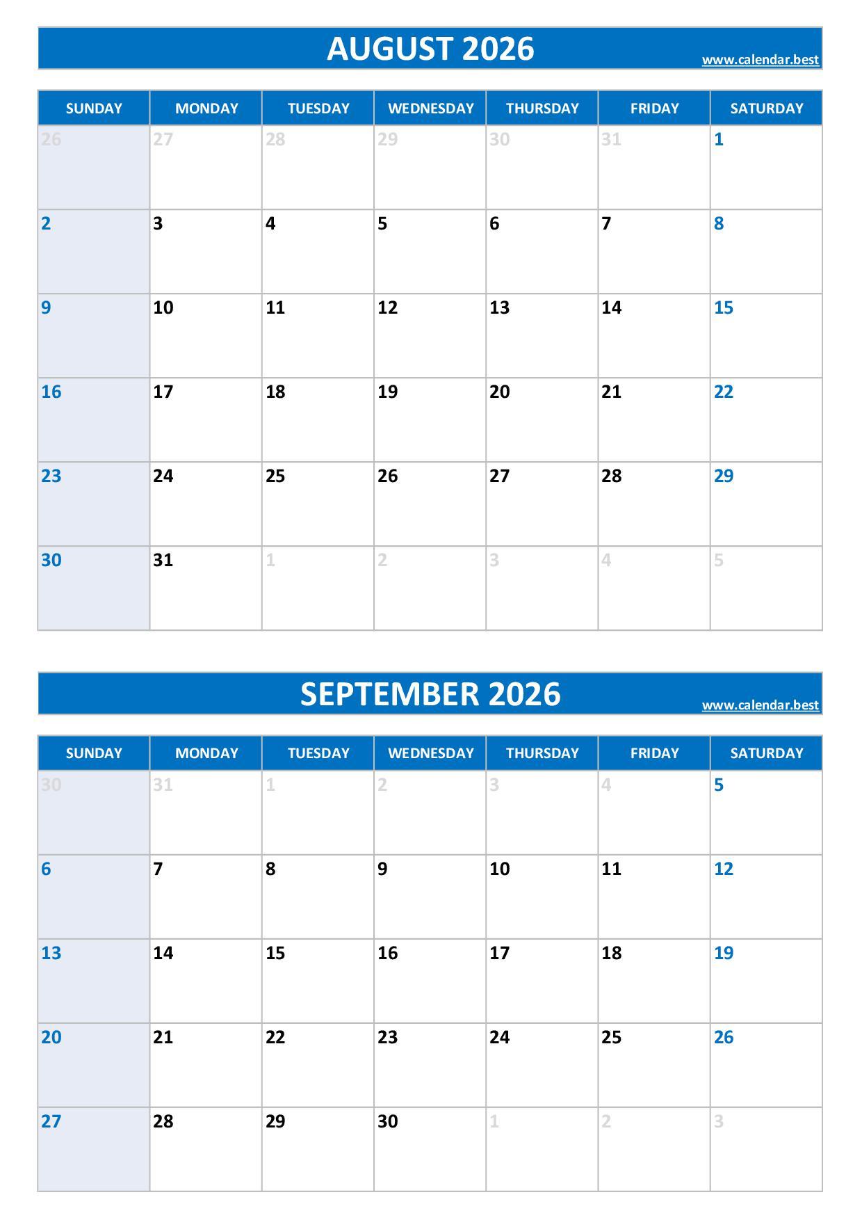 August and September 2026 blank calendar to print