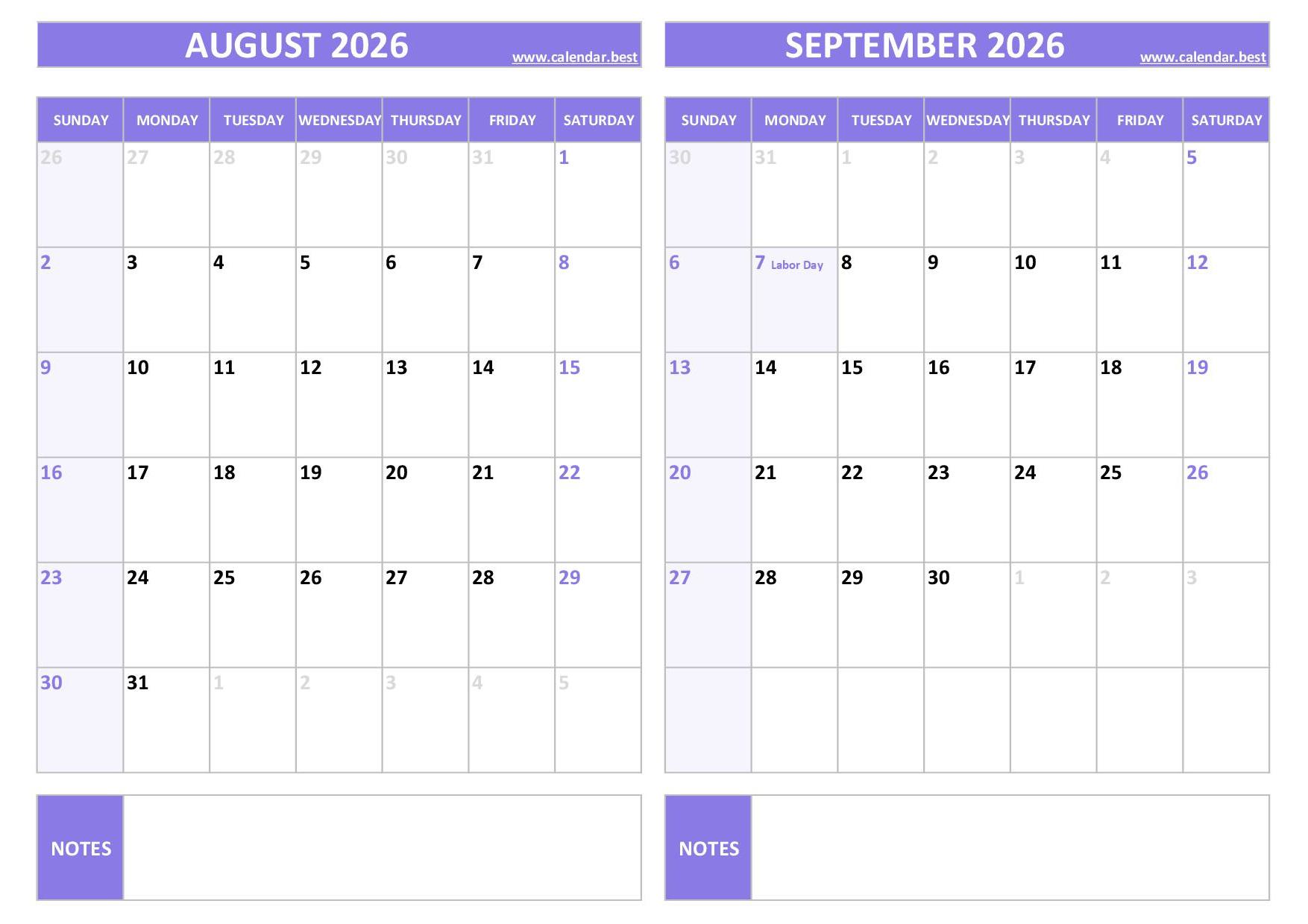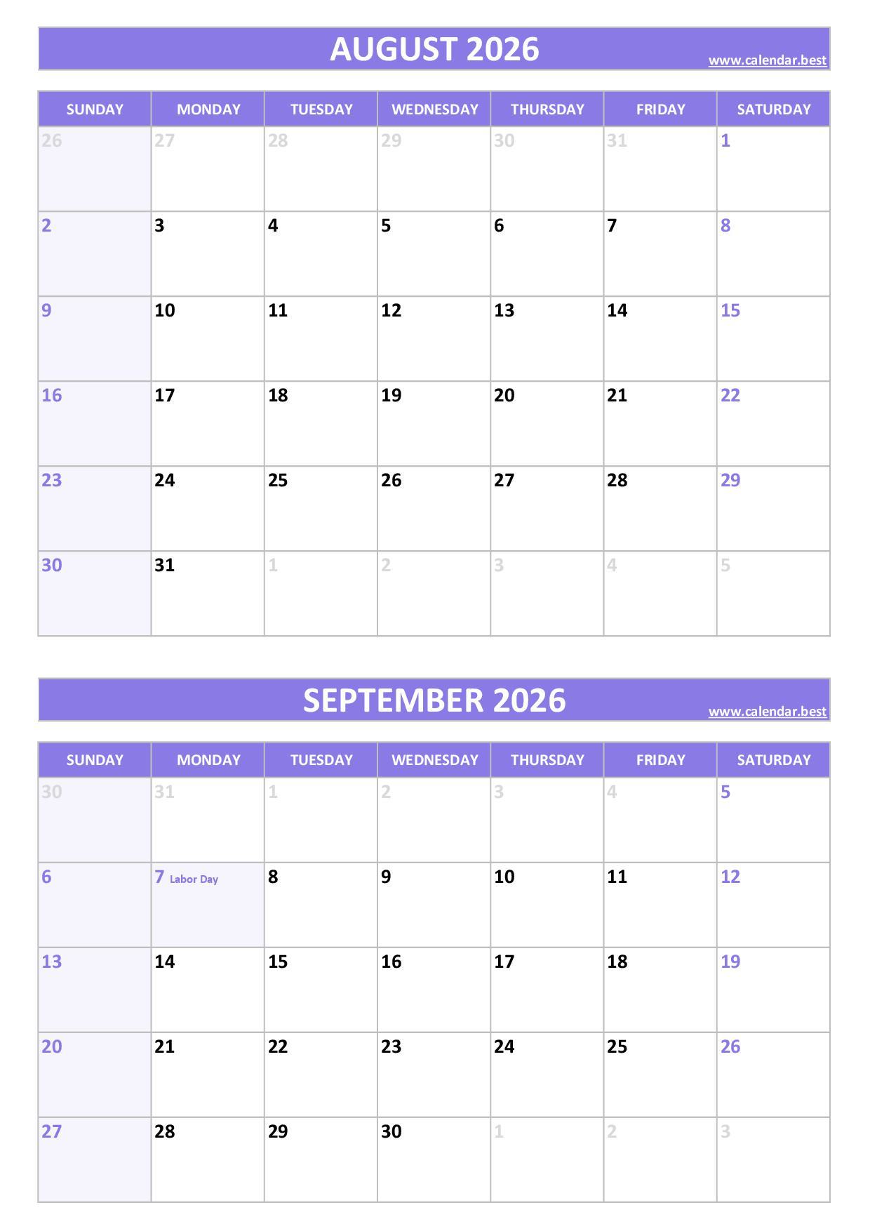 Download your free printable August and September 2026 calendar featuring US federal holidays. This two-month layout spans from August 1 to September 30, 2026, and highlights major dates like Labor Day (Monday, September 7, 2026). Choose your style (blue or purple), in A4 portrait or landscape, and print as a PDF or JPG.