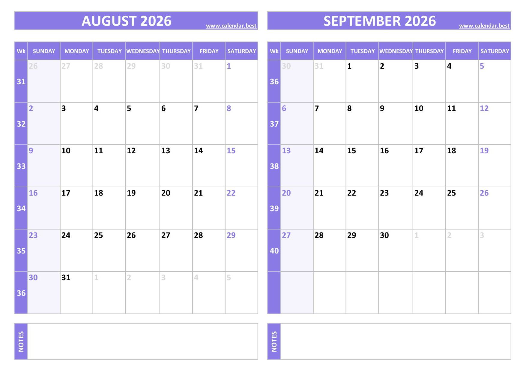 Perfect for teachers, students, or weekly planning at work, this free printable calendar for August and September 2026 features US week numbers, where each week starts on Sunday. Covering week 31 to week 40, it provides a clear two-month overview. Choose your preferred design in blue or purple and print it in A4 format, portrait or landscape, available as PDF or JPG.