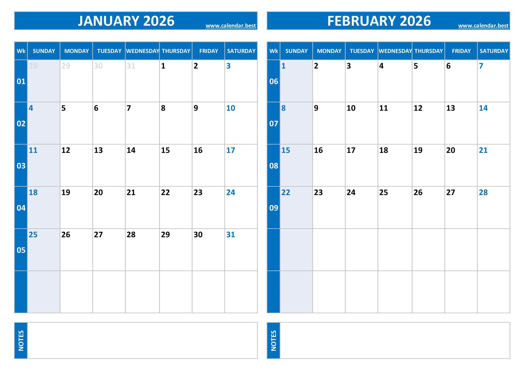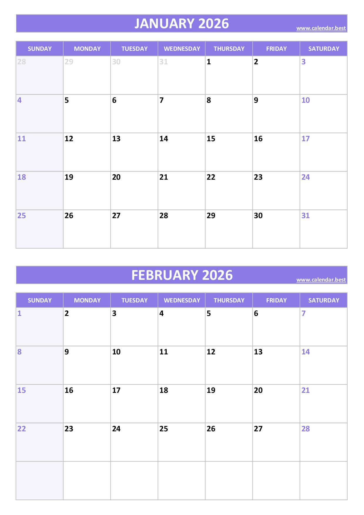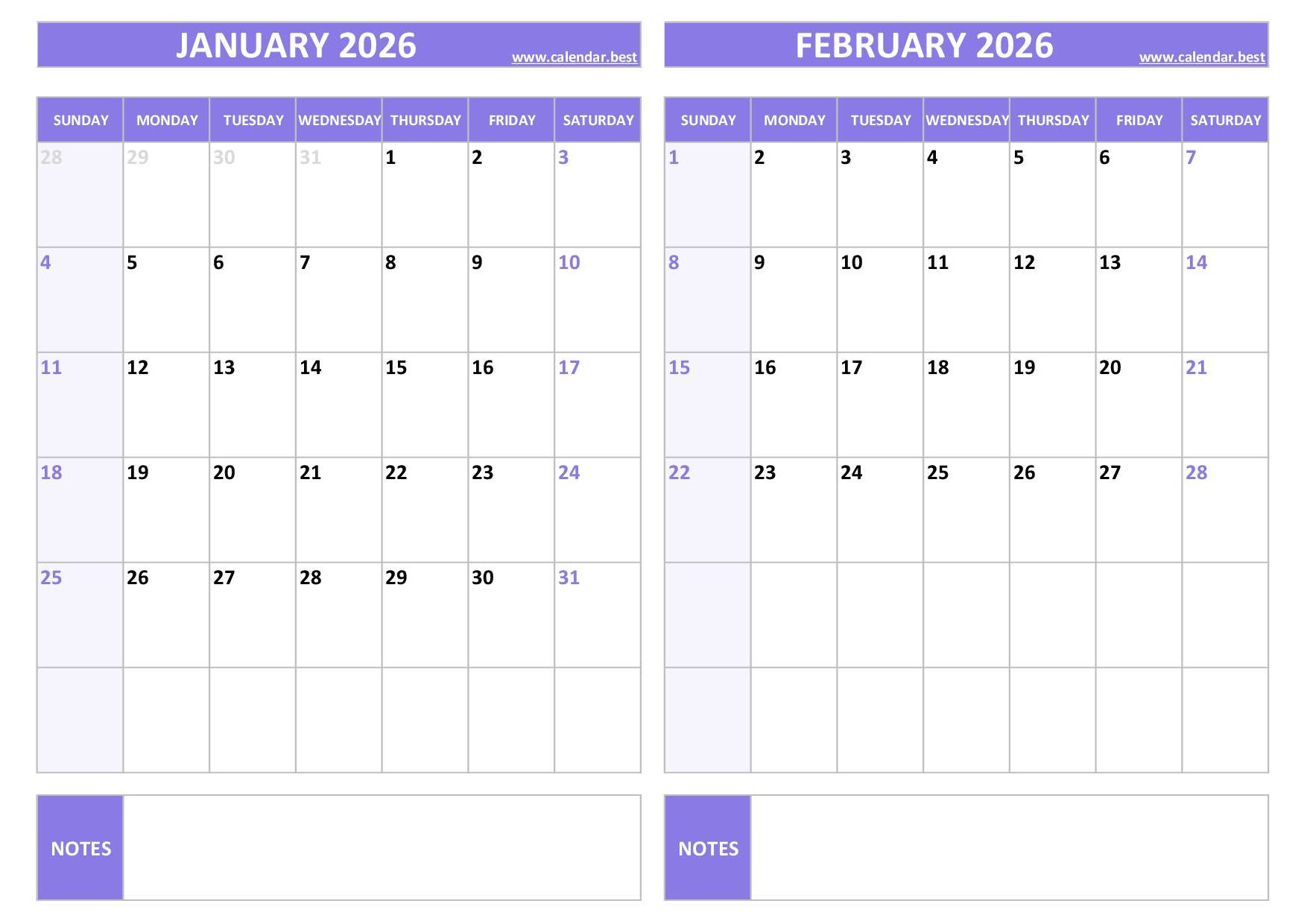 Discover and download our free printable January and February 2026 calendars, all combined on a single page to help you plan your two-month schedule easily.