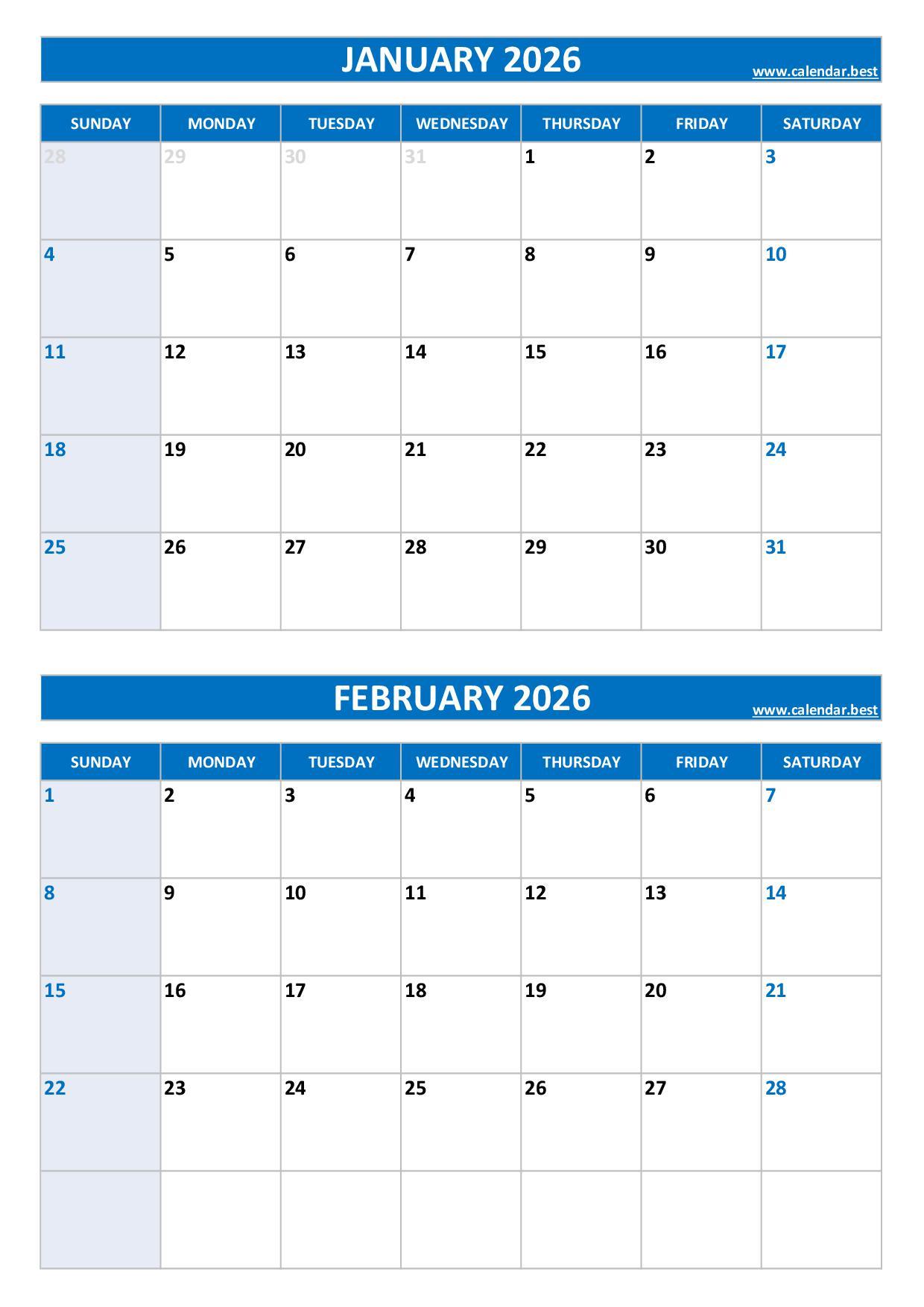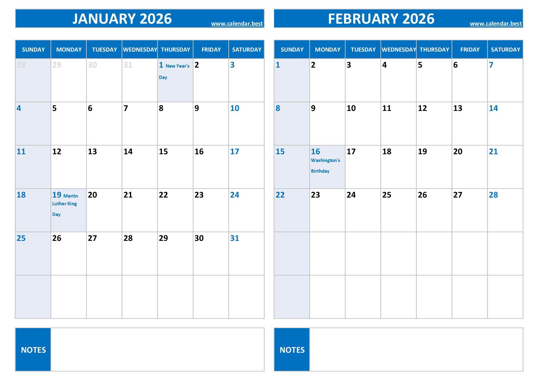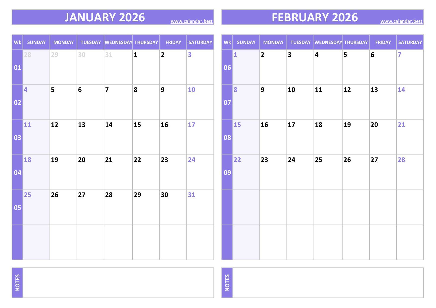 Discover and download our free printable January and February 2026 calendars, all combined on a single page to help you plan your two-month schedule easily.