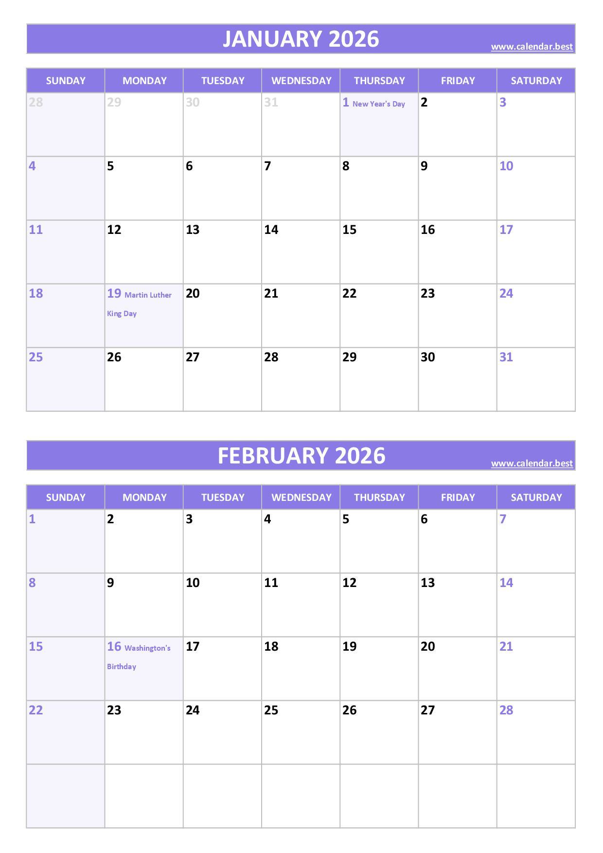 Download your free printable January and February 2026 calendar featuring US federal holidays. This two-month layout spans from January 1 to February 28, 2026, and highlights major dates like New Year's Day (Thursday, January 1, 2026), Martin Luther King Day (Monday, January 19, 2026) and Washington's Birthday (Monday, February 16, 2026). Choose your style (blue or purple), in A4 portrait or landscape, and print as a PDF or JPG.