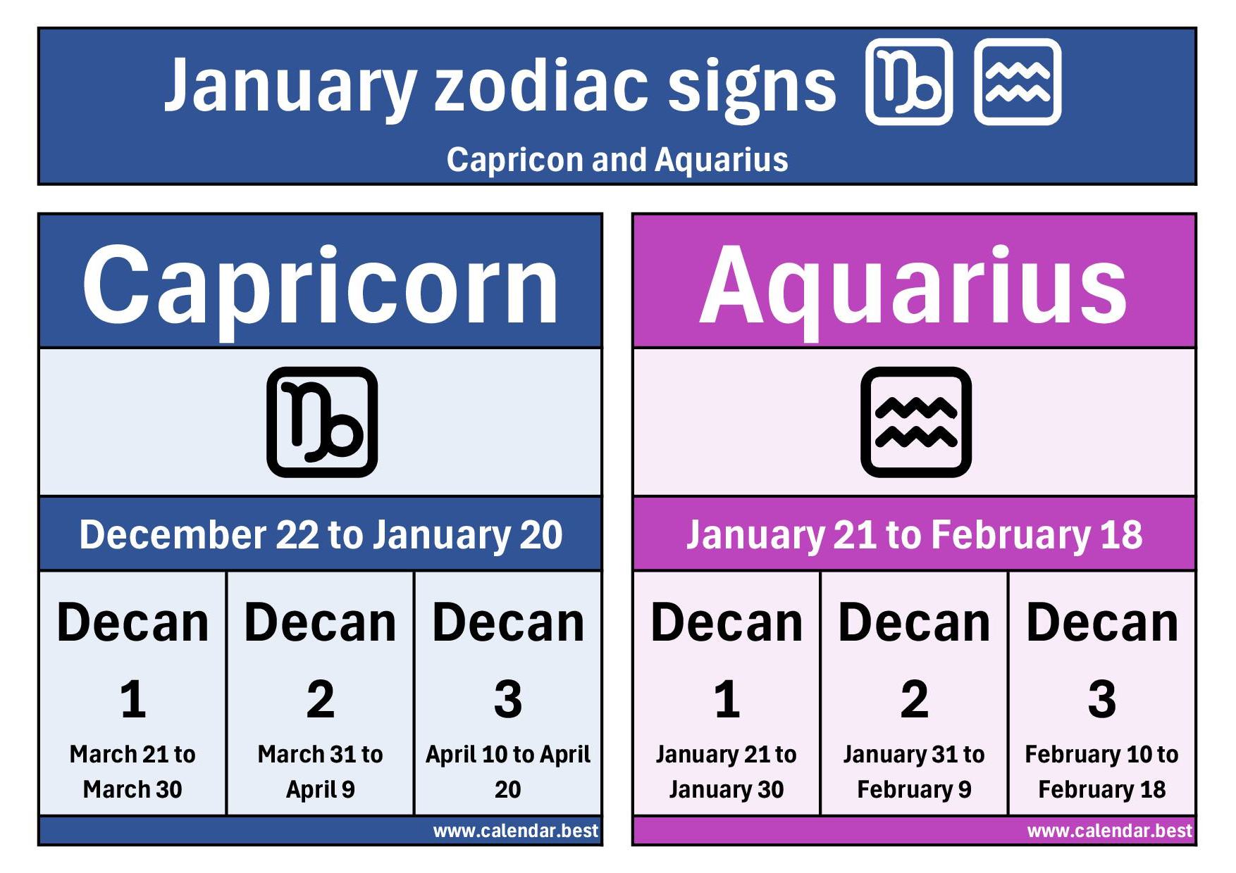 Capricorn covers the first part of January, from December 22 to January 20, while Aquarius begins on January 21 and continues into February.