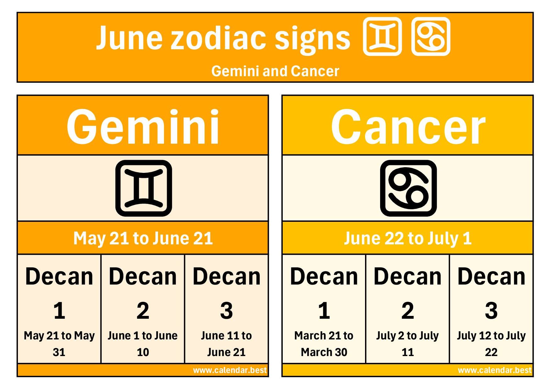 | In June, Gemini (Air) runs from June 1 to 21 (Decans 2 and 3) and Cancer (Water) from June 22 to 30 (Decan 1, continuing into July). | |||