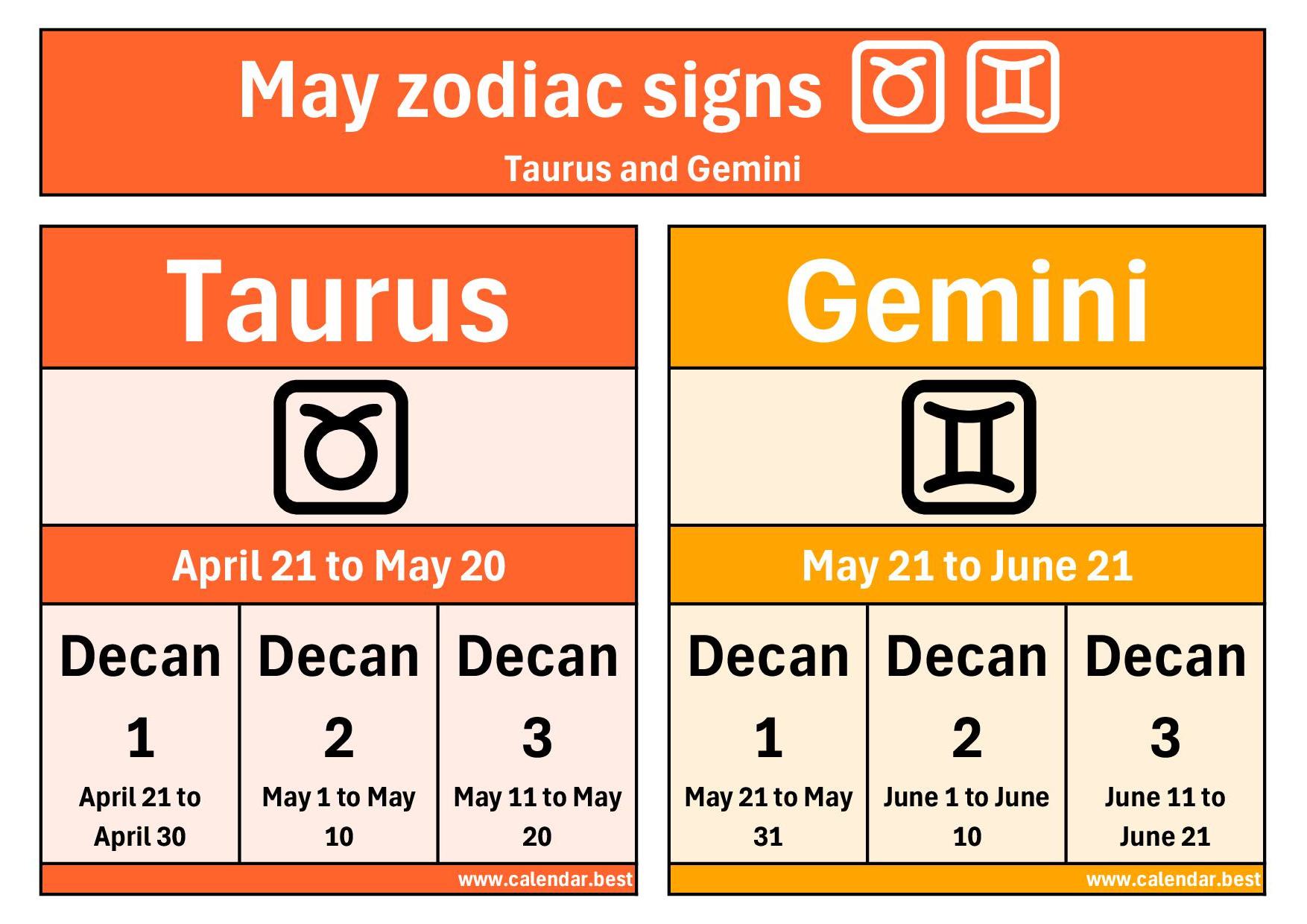 May zodiac signs - summary table with dates and decans