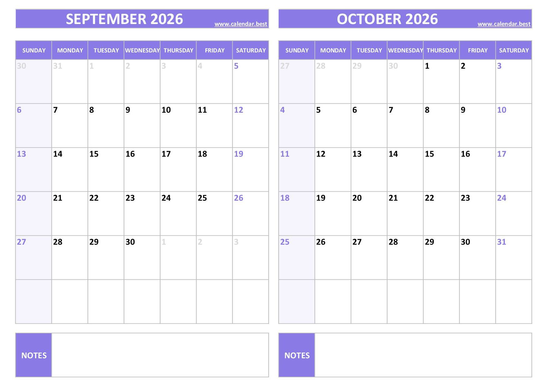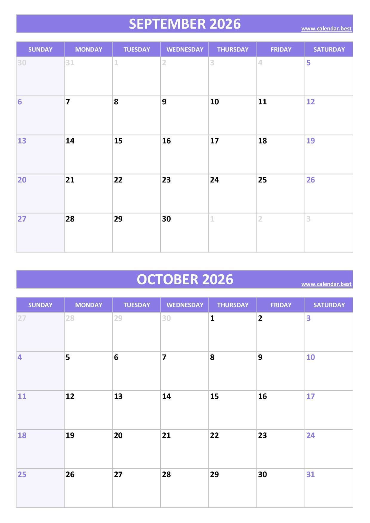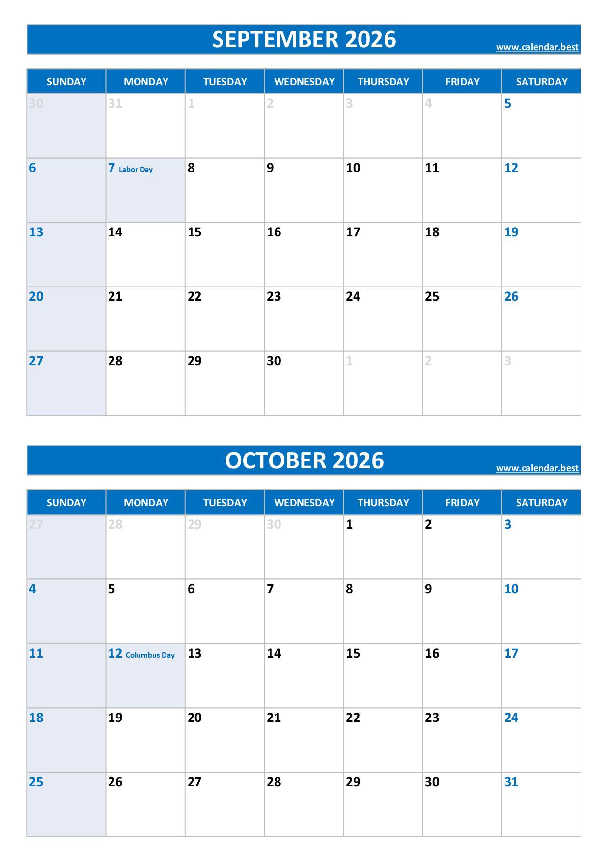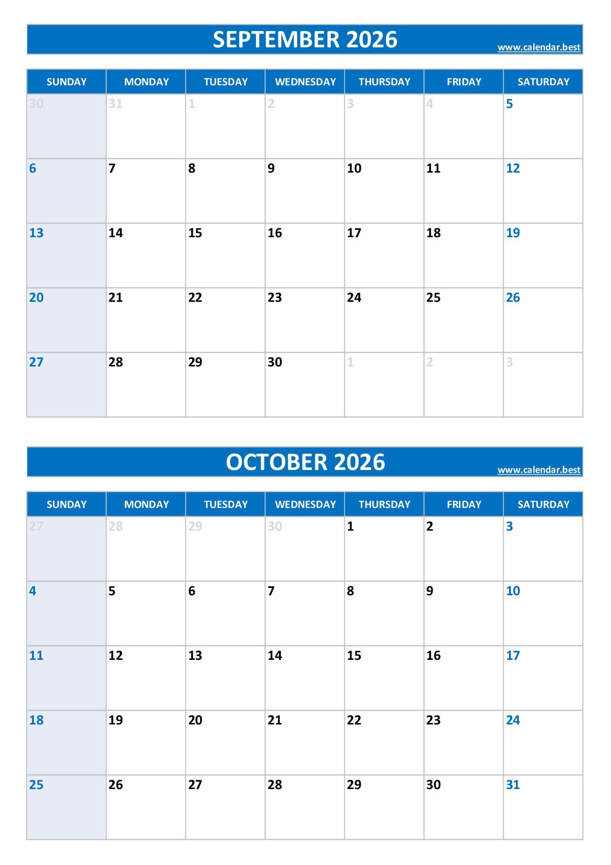 Discover and download our free printable September and October 2026 calendars, all combined on a single page to help you plan your two-month schedule easily.