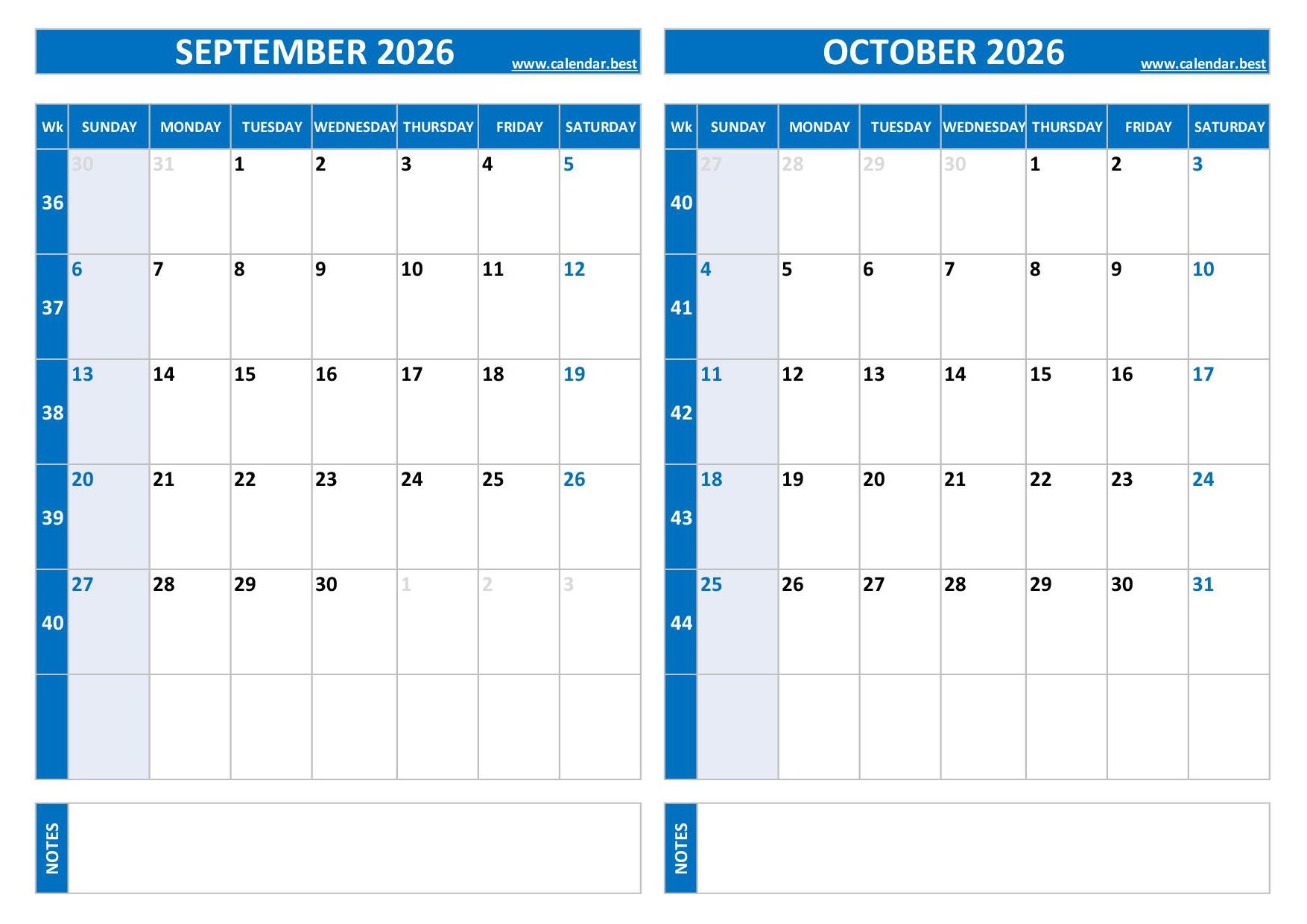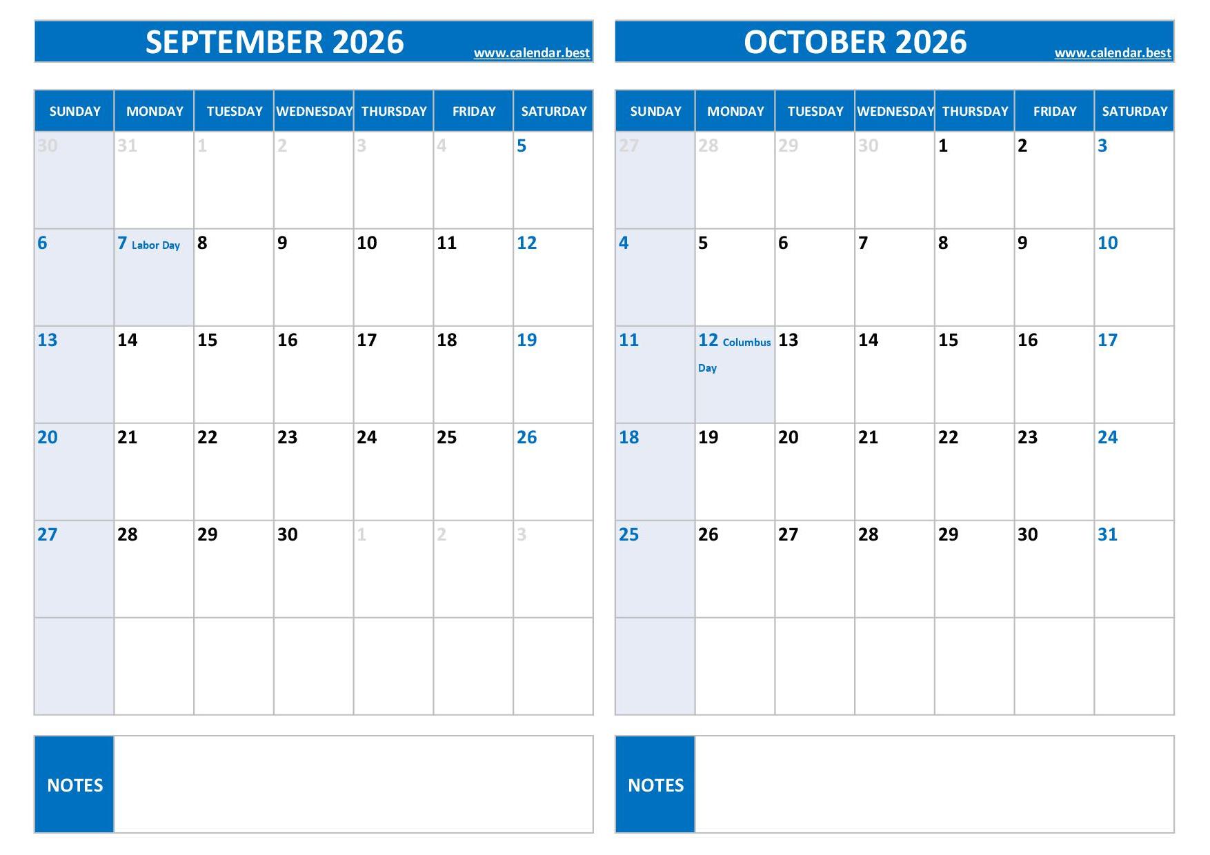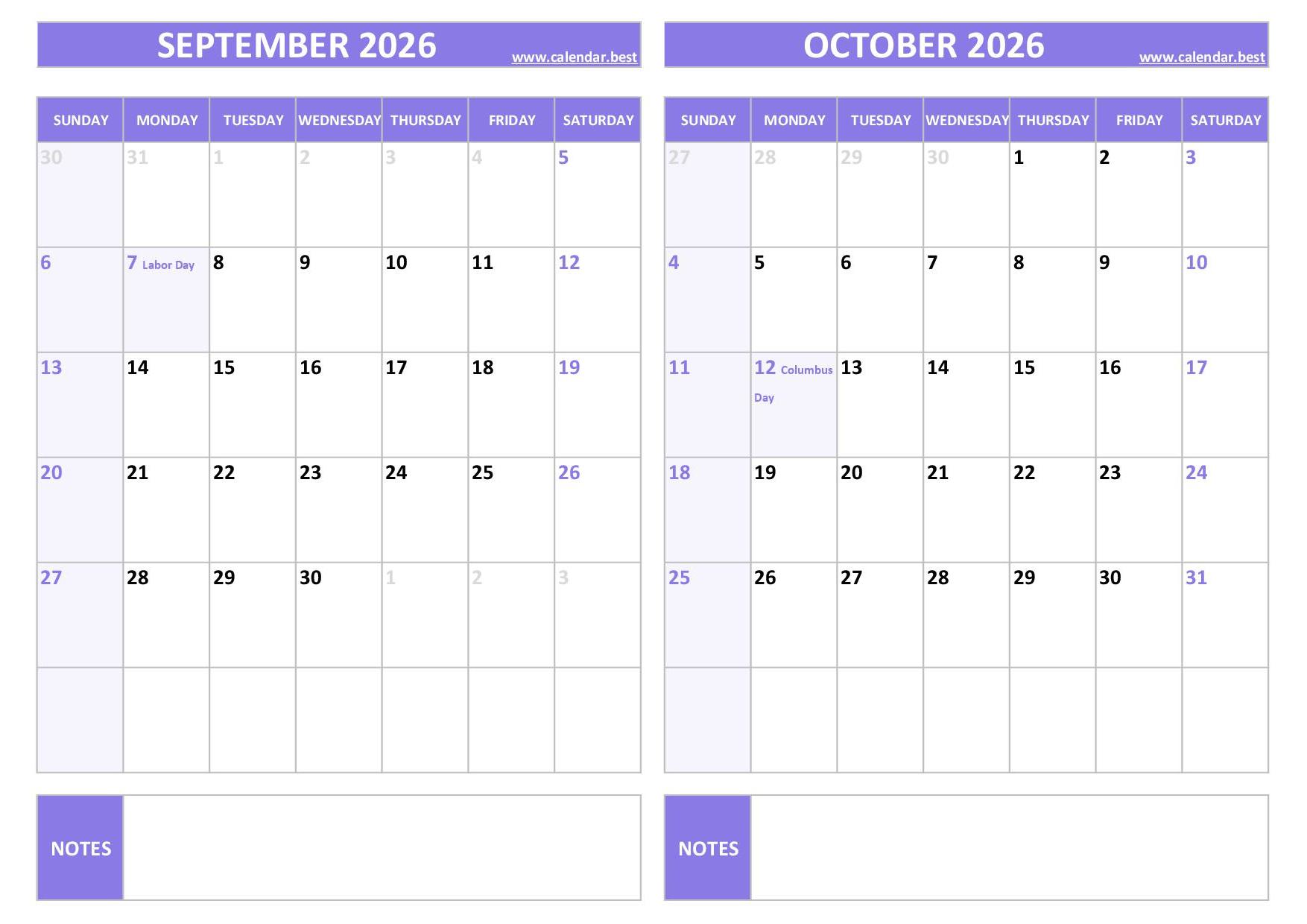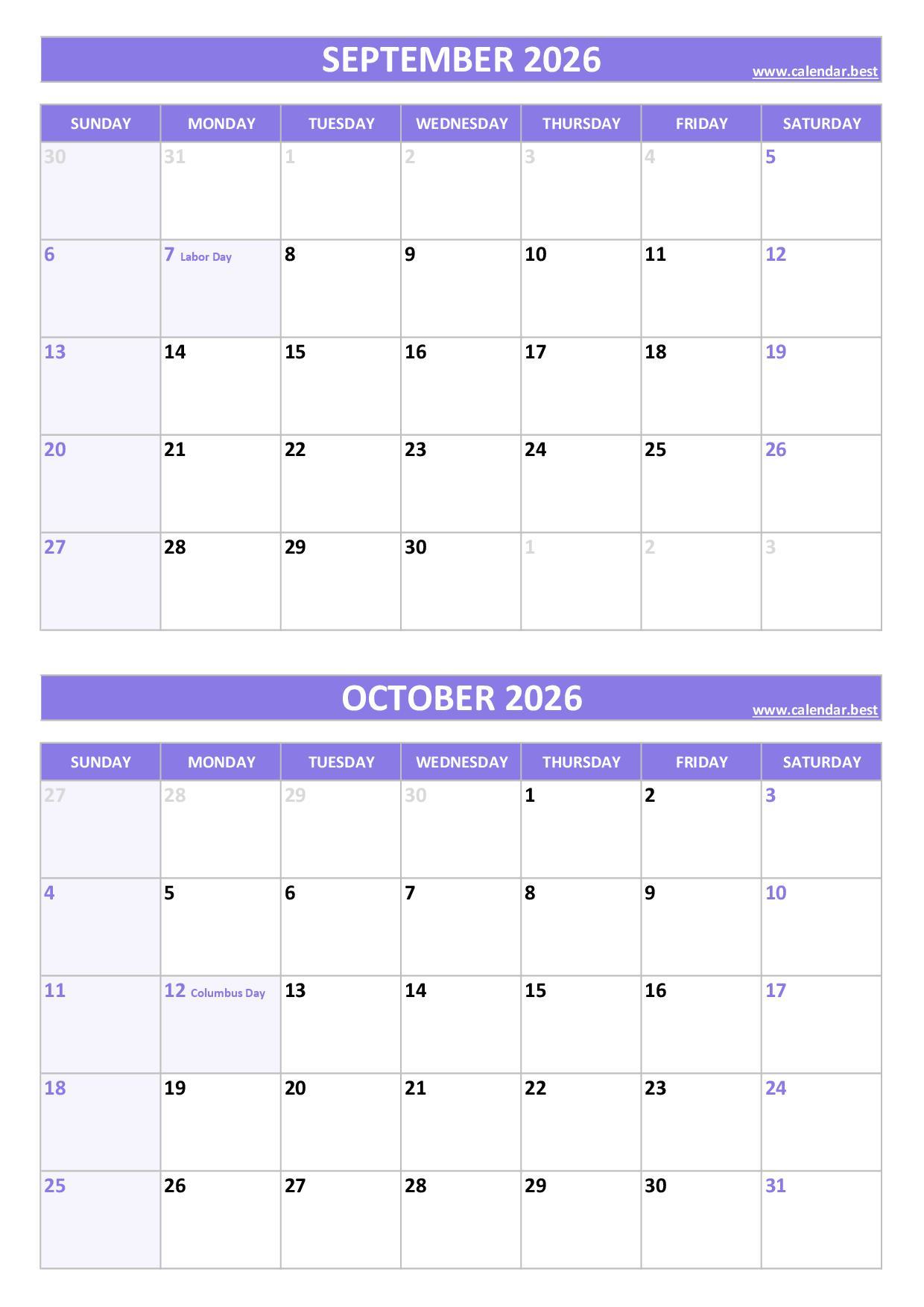 Discover and download our free printable September and October 2026 calendars, all combined on a single page to help you plan your two-month schedule easily.