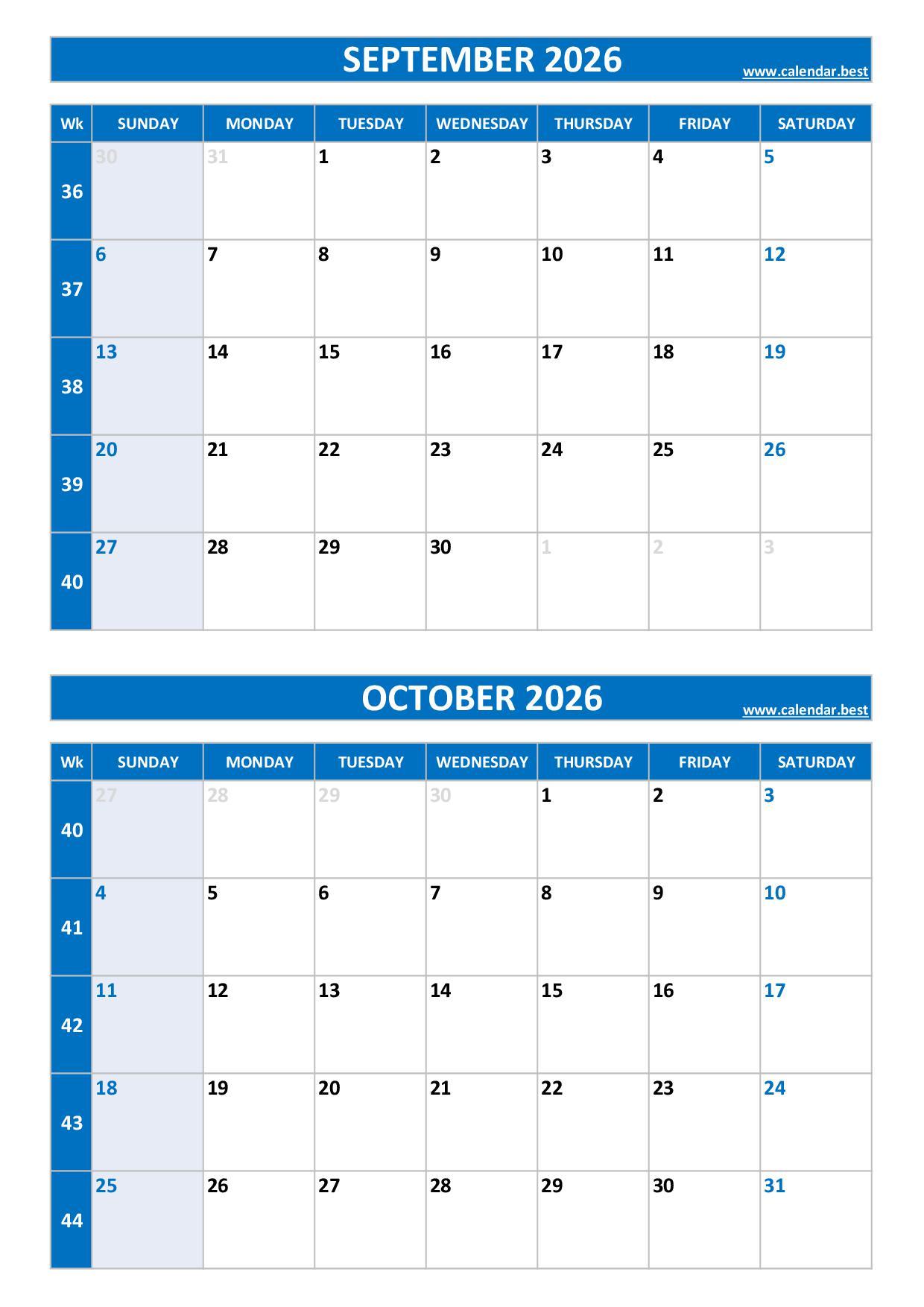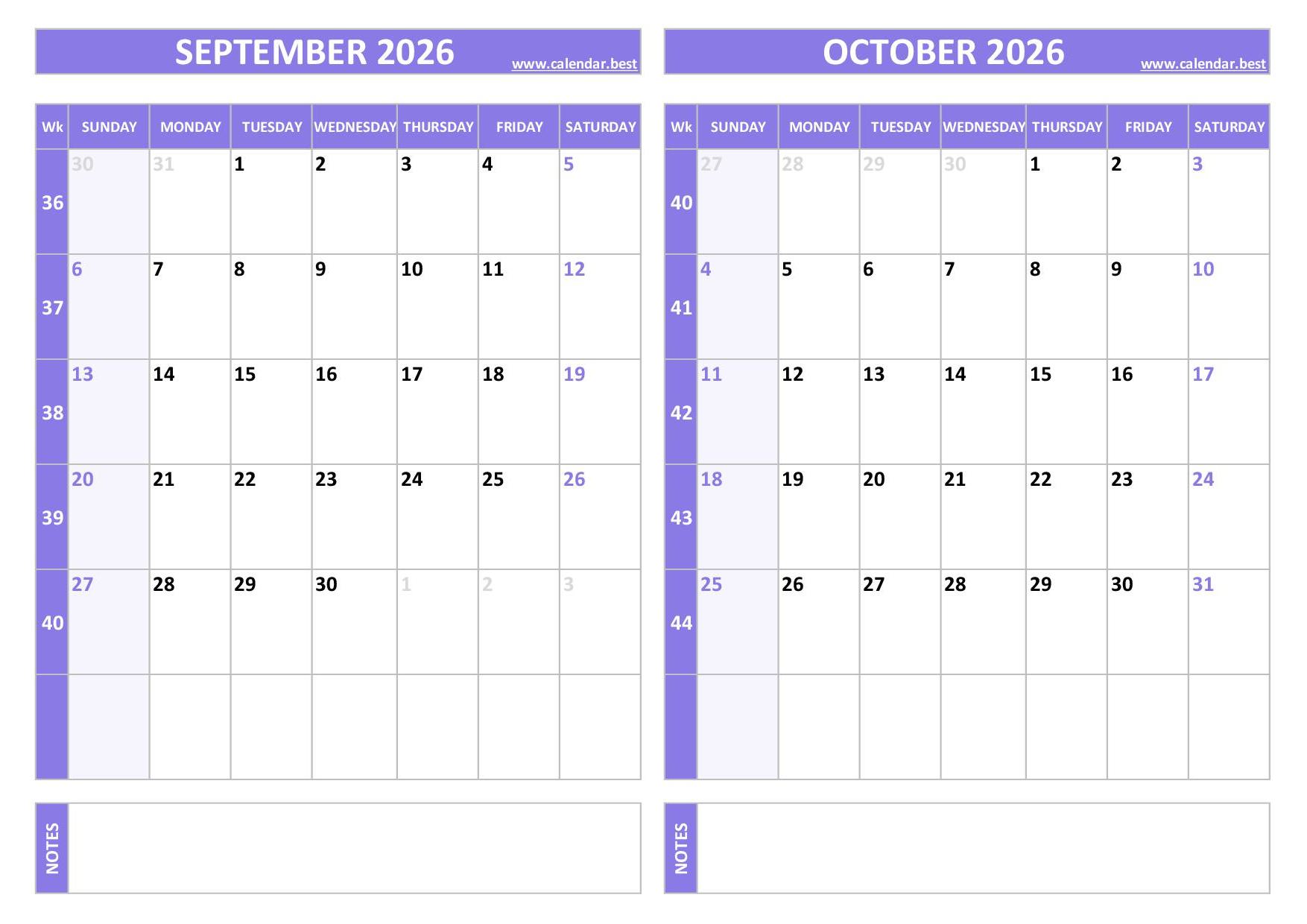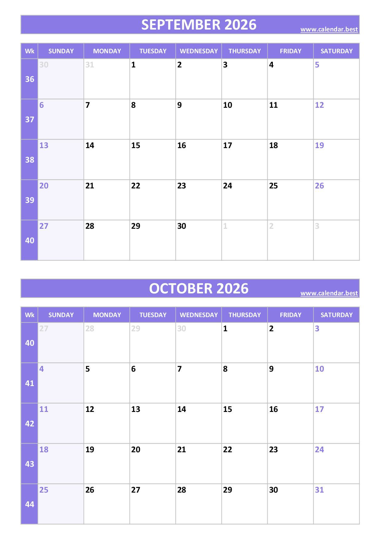Perfect for teachers, students, or weekly planning at work, this free printable calendar for September and October 2026 features US week numbers, where each week starts on Sunday. Covering week 36 to week 44, it provides a clear two-month overview. Choose your preferred design in blue or purple and print it in A4 format, portrait or landscape, available as PDF or JPG.