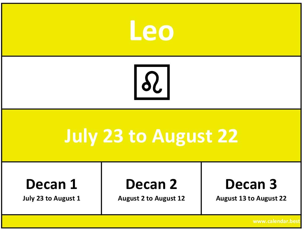 The table below lists all the Leo dates from July 23 to August 22, with the corresponding decan. This is useful if you want to check if a specific birthday is Leo and to know its decan.