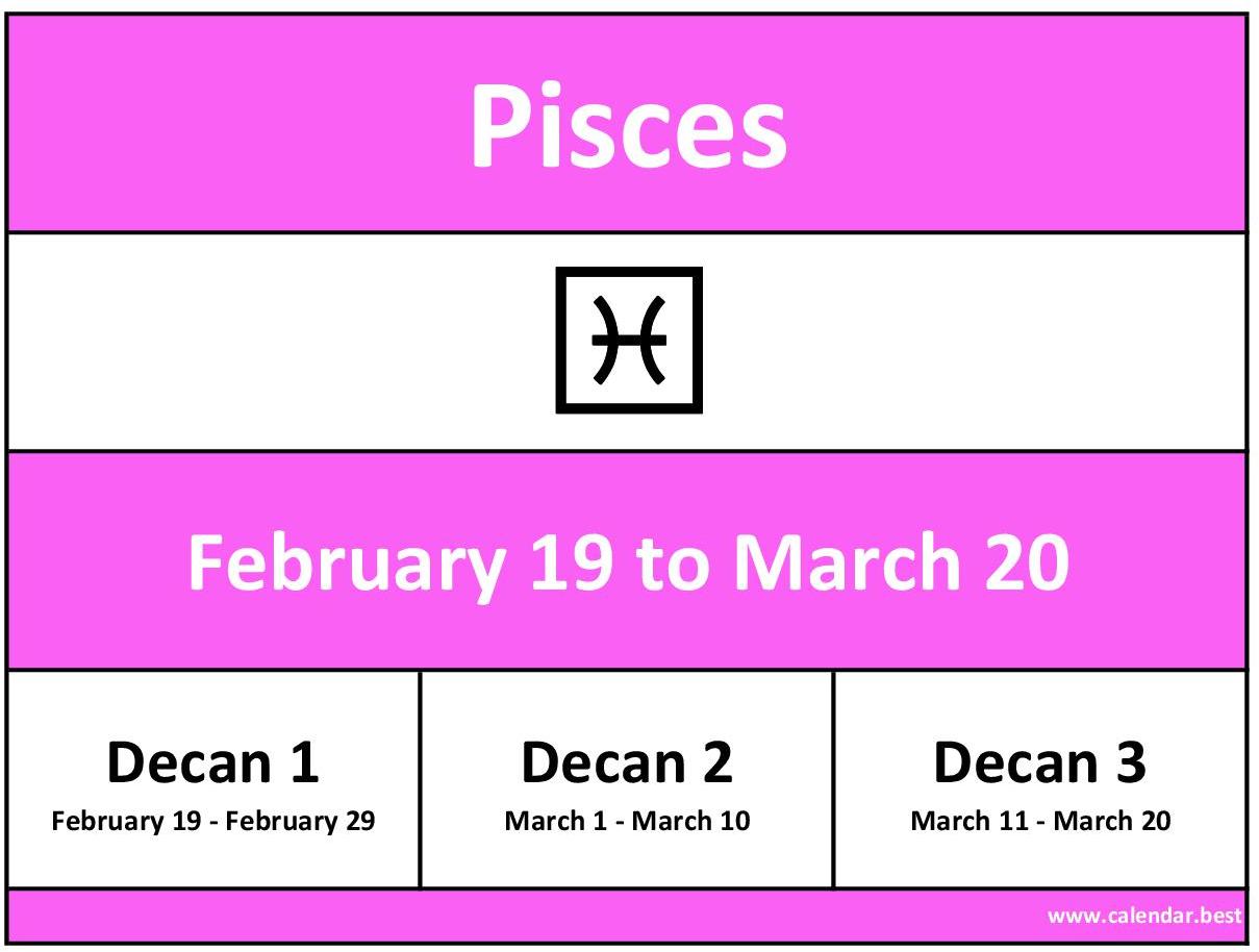The table below lists all the Pisces dates from February 19 to March 20, with the corresponding decan. This is useful if you want to check if a specific birthday is Pisces and to know its decan.