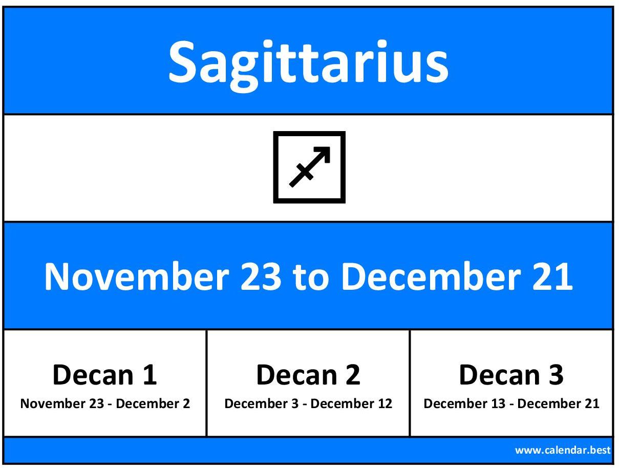 The table below lists all the Sagittarius dates from November 23 to December 21, with the corresponding decan. This is useful if you want to check if a specific birthday is Sagittarius and to know its decan.