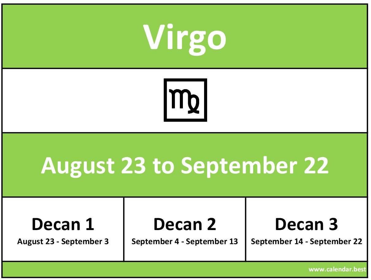 The table below lists all the Virgo dates from August 23 to September 22, with the corresponding decan. This is useful if you want to check if a specific birthday is Virgo and to know its decan.